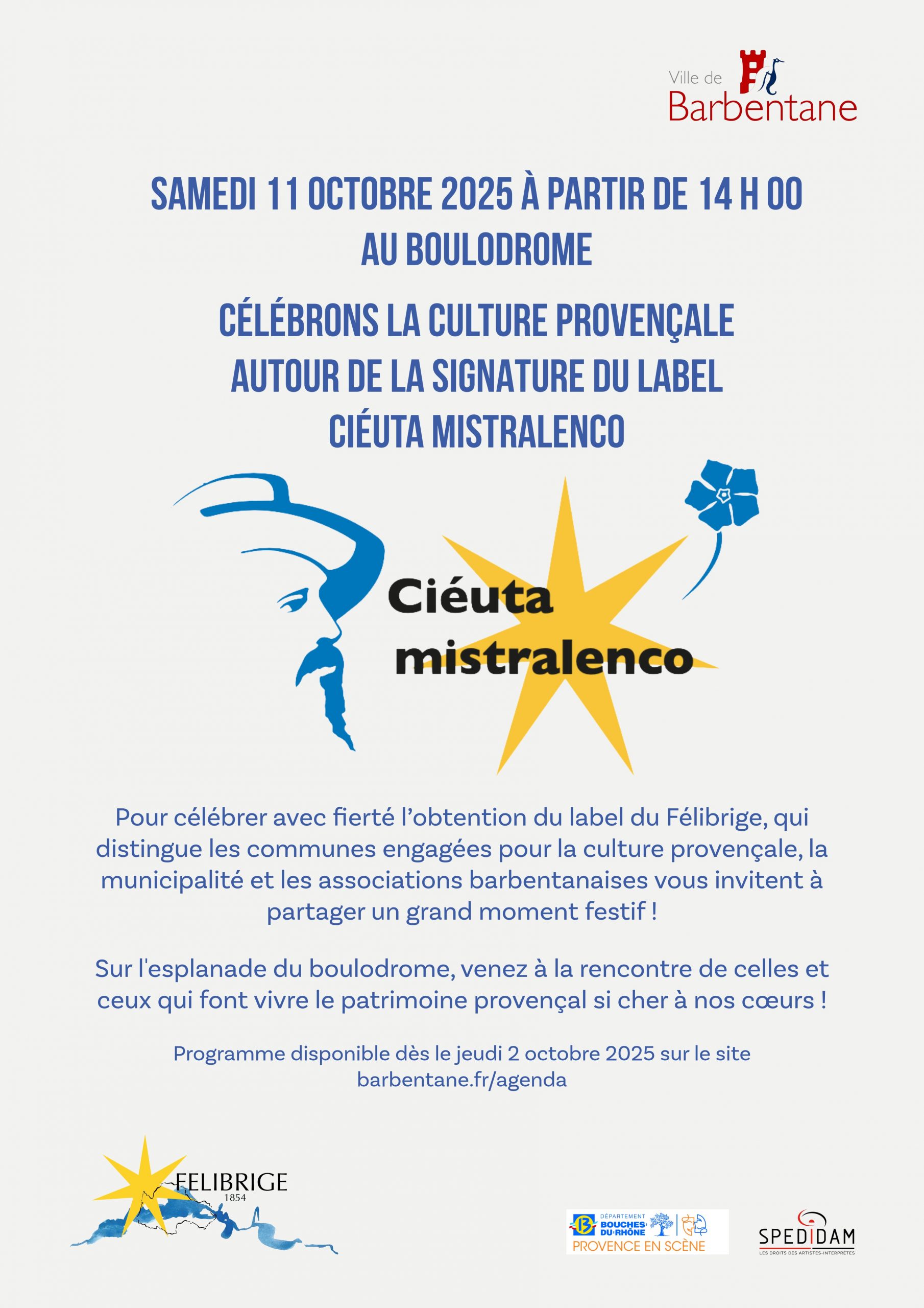 La municipalité et les associations barbentanaises vous invitent à partager un grand moment festif autour de la signature du label Ciéuta Mistralenco.