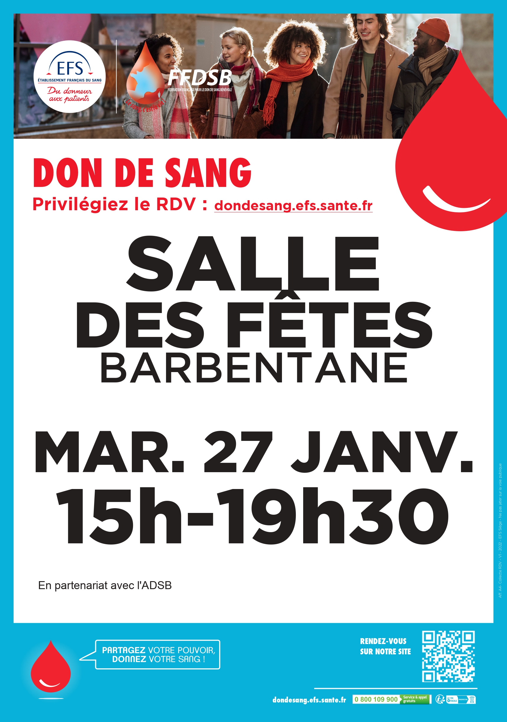 Rejoignez la prochaine collecte de sang organisée le mardi 27 janvier de 15h à 19h30 en salle des fêtes de Barbentane en prenant RDV ici : https://efs.link/JF5Qb