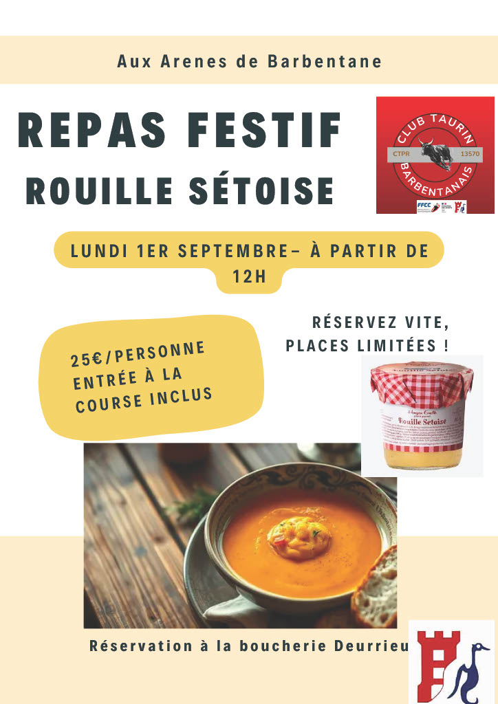13h00 : Repas festif aux arènes municipales organisé par le Club Taurin. Animé par la pena Les Astres aux Notes. Rouille sétoise. Réservations à la Boucherie Deurrieu. Tarif : 25 euros avec entrée à la course. – ANNULE
