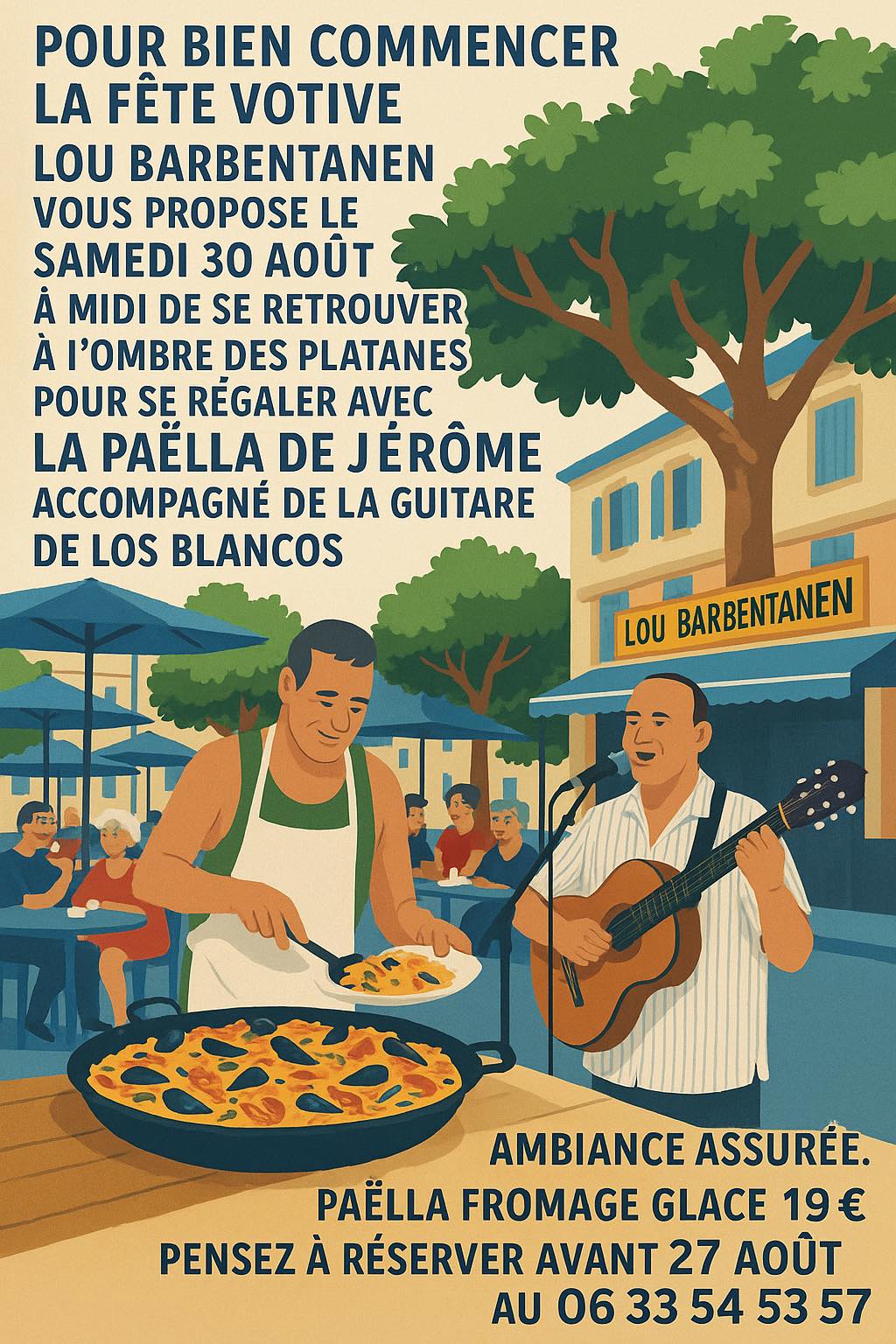 12h00 : Lou Barbentanen vous propose de venir déguster la paëlla de Jérôme à l’ombre des platanes et au son des guitares de Los Blancos. Réservations jusqu’au 25 août au Bar Lou Barbentanen – Prix : 19 euros (plat, fromage et dessert)