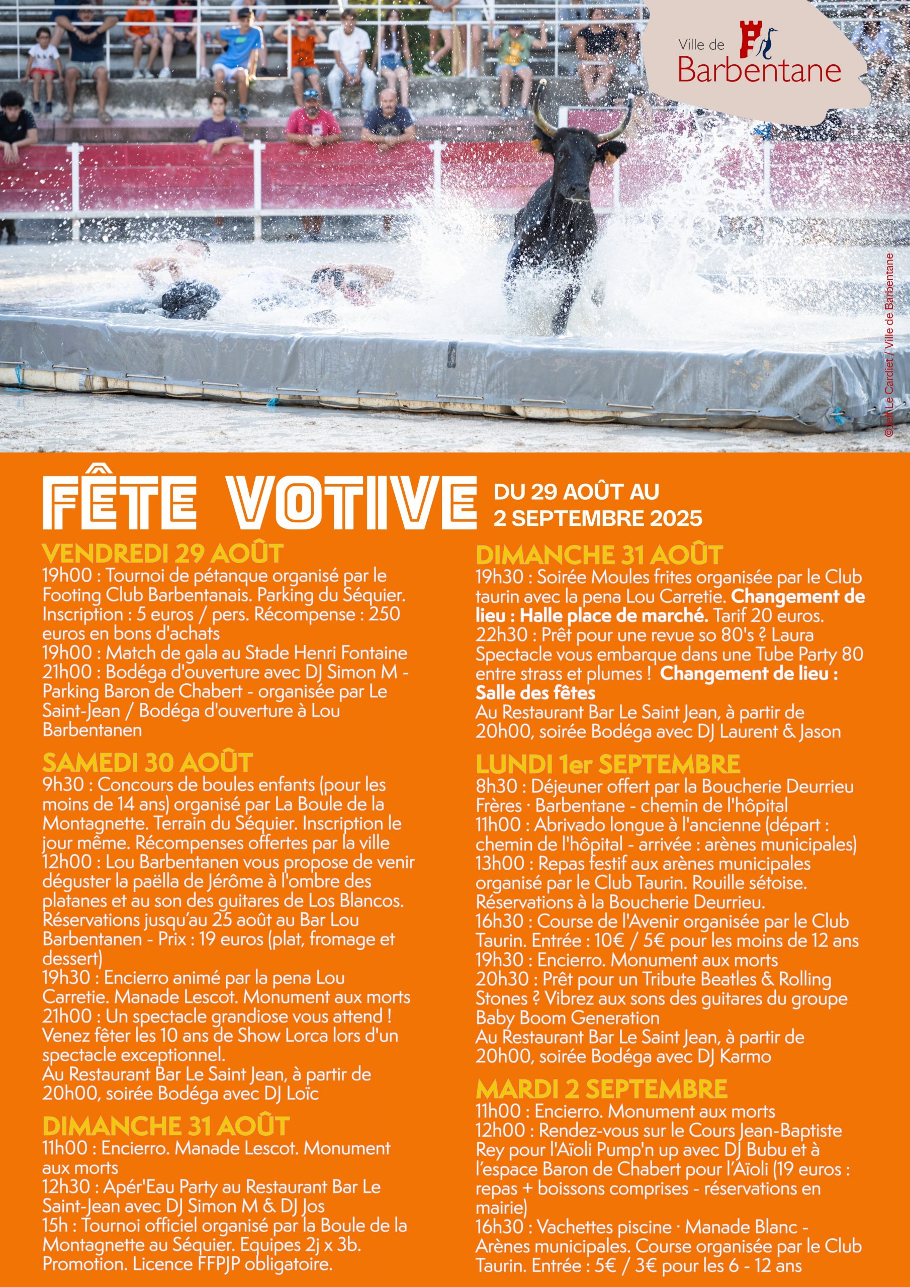 19h30 : Soirée Moules frites organisée par le Club taurin avec la pena Lou Carretie. Tarif : 20 euros. Réservation : Boucherie Deurrieu (tél. : 04 90 95 50 20) Changement de lieu : Halle de la place du marché