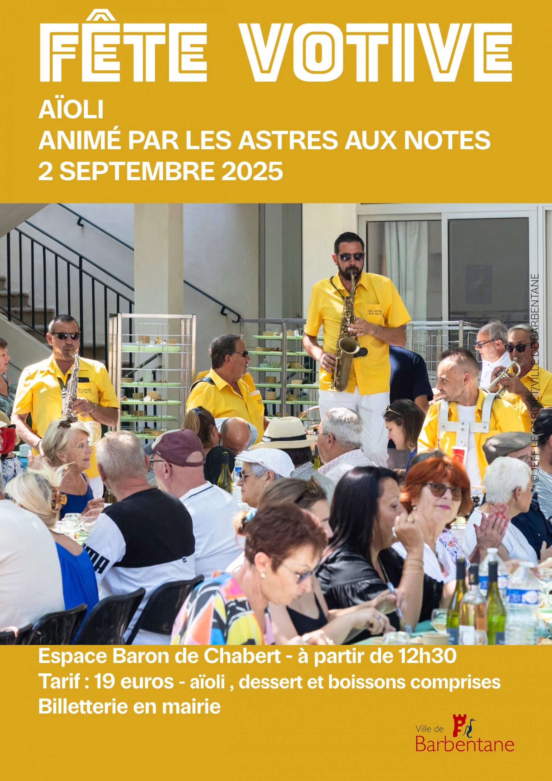12h00 : Rendez-vous sur le Cours Jean-Baptiste Rey pour l’Aïoli Pump’n up avec DJ Bubu et à l’espace Baron de Chabert pour l’Aïoli (19 euros : repas + boissons comprises – réservations en mairie)