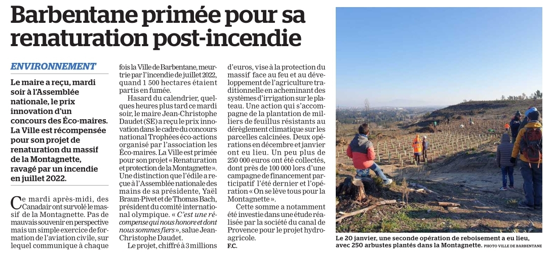 Lauréate parmi des dizaines de dossiers de candidatures provenant de toute la France, la commune de Barbentane a été désignée par le jury de spécialistes qui la compose pour son projet « Renaturation et protection de la Montagnette ».