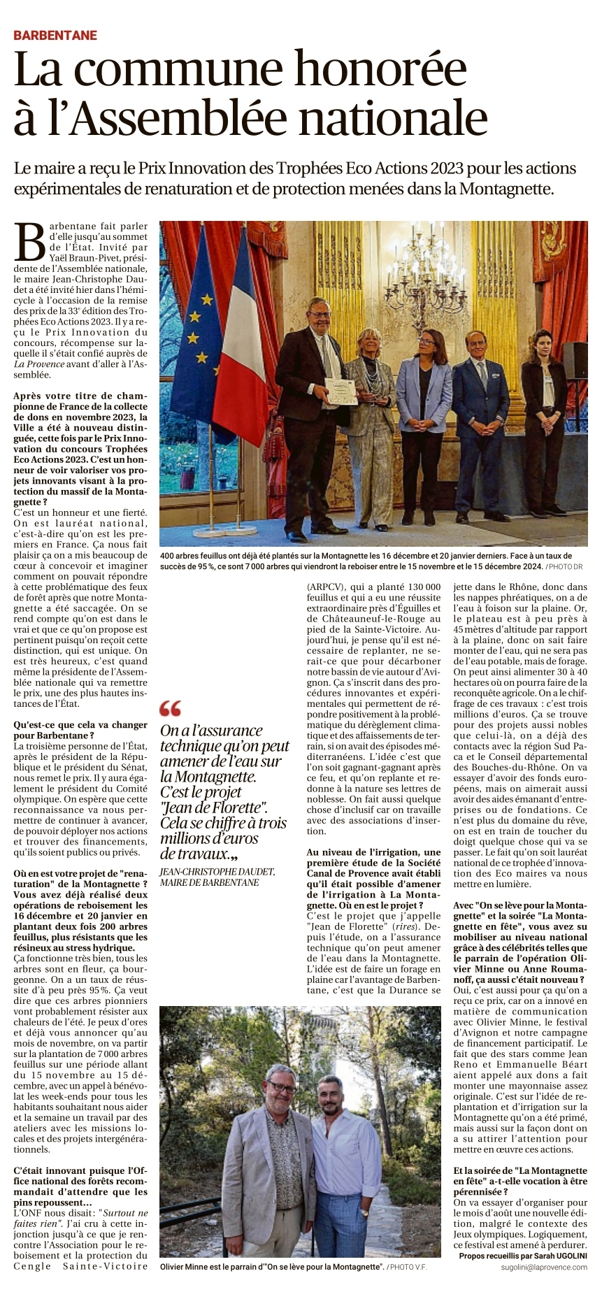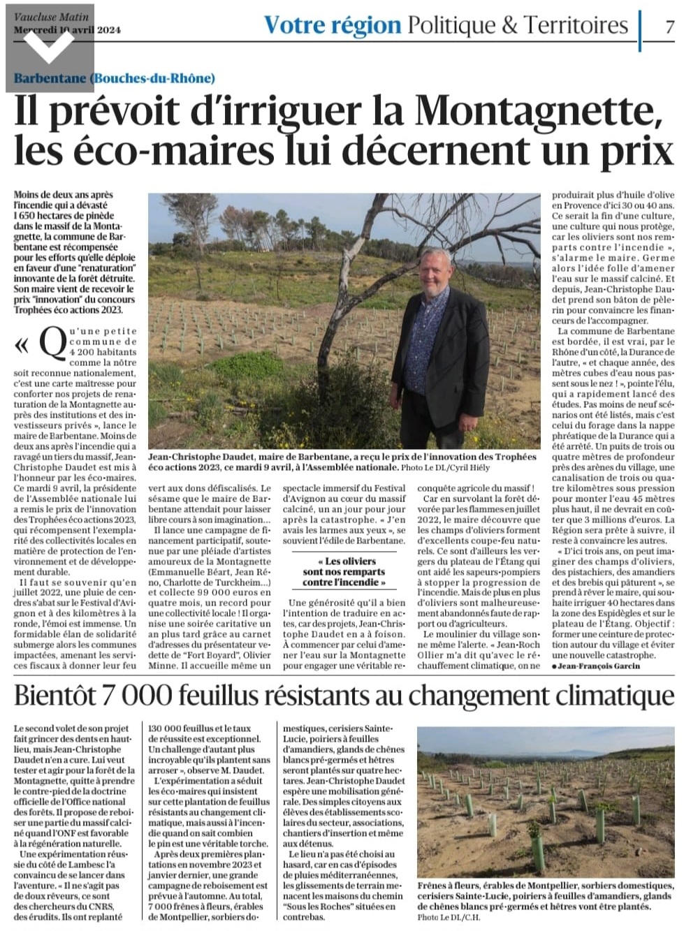 Ce projet s’articule autour de deux grands axes : la reconquête d’une agriculture provençale traditionnelle sur le plateau en aménageant un système d’irrigation qui servira également de pare-feu pour protéger le massif ; la plantation de plusieurs milliers d’arbres feuillus dès cet automne sur le secteur de la croix des veuves. Les membres du jury ont également été attentifs à l’opération « On se lève pour la Montagnette », la levée de fonds participative, le spectacle la Montagnette en fête et l’organisation par le festival d’Avignon de 6 représentations de « Que ma joie demeure » en hommage à la Montagnette. Le travail sur la biodiversité et l’éducation des enfants à l’environnement ont également été salués. Tous ces éléments et projets si originaux expliquent en grand partie le fait que le prix de l’innovation ait été attribuée à la commune de Barbentane.